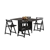 5-piece Space saver dining set comes complete with 4 chairs stowed inside! Entertain anywhere by simply lifting the handle and using the back wheel to guide the table to your destination. Both drop leafs easily stay upright when supported by the gate leg that pulls out from under the table. Stores all four chairs inside of the table base for hidden storage. Seat up to six people for a meal or game. Increases from 8"x36" to 36"x60". Features: Black finish Stores all four chairs inside of the table base for hidden storage Casters for easy mobility Increases from 8"x36" to 36"x60" Leafs easily stay upright when supported by the gate leg that pulls out from under the table Material: Veneer over solid MDF Some Assembly Required Specifications: Table Open Dimensions: 58"W x 36"D x 29"H Table Closed Dimensions: 13"W x 36"D x 29"H Chair Dimensions: 17.88"W x 20.68"D x 31"H Seat Height: 18" Weight: 135.58 lbs Color: Black Size: 58"W x 29"H x 36"D Black finish Stores all four chairs inside of the table base for hidden storage Casters for easy mobility